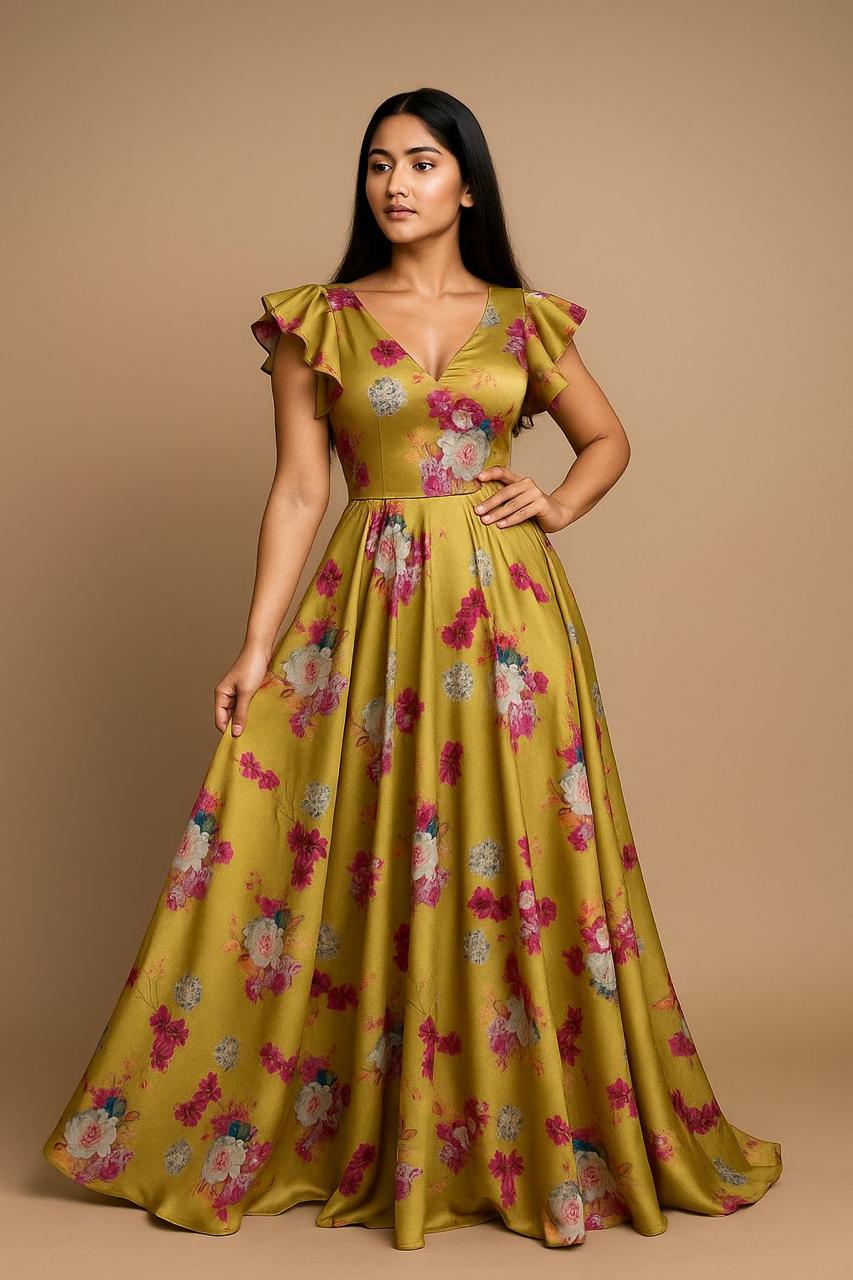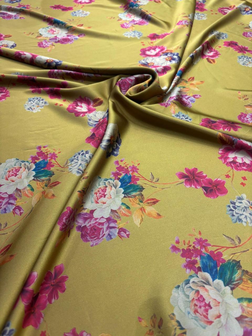 Brighten up your designs with our premium yellow floral printed satin fabric. With a smooth texture and subtle shine, this fabric offers a graceful flow and elegant finish, making it ideal for both festive and everyday wear.