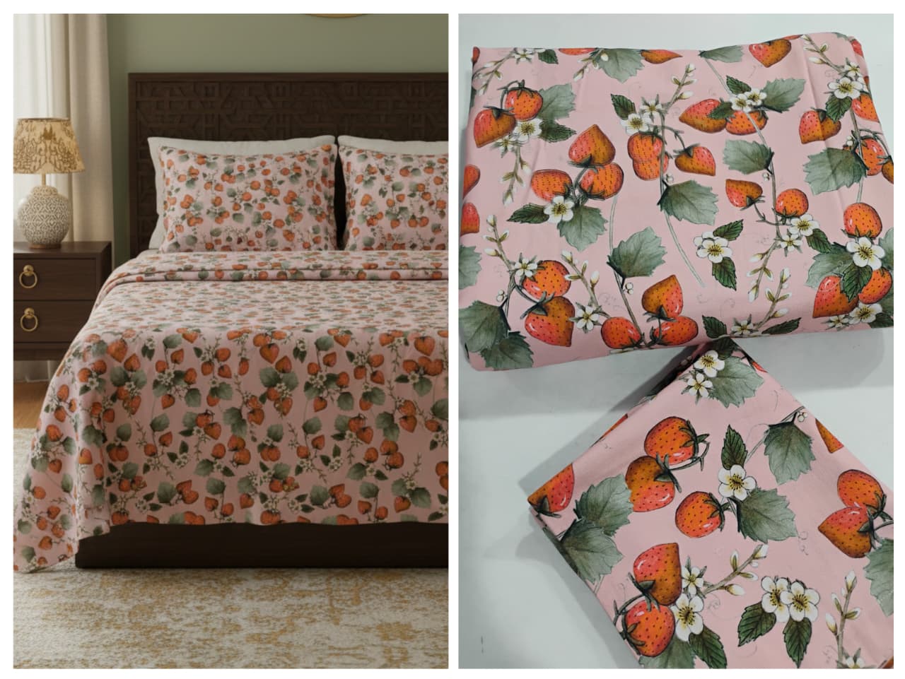 Bring a fresh and soothing charm to your bedroom with this beautiful king size bedsheet featuring delicate strawberry and floral prints on a soft pastel pink base. The graceful design creates a calm, cozy, and refreshing ambiance, perfect for everyday comfort.