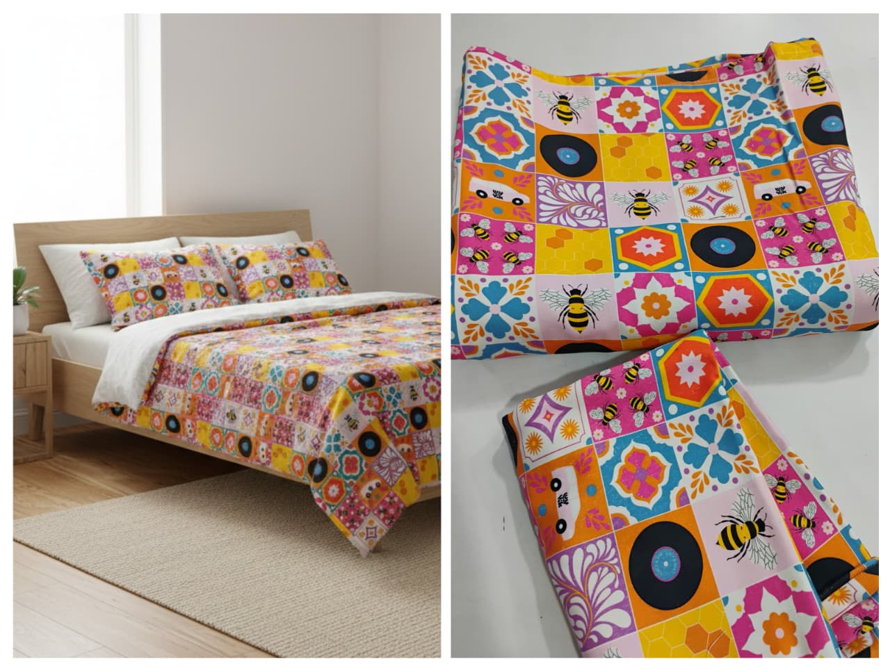 Infuse your bedroom with joy and vibrancy using this eye-catching king size bedsheet featuring a playful patchwork print with floral and bee motifs. Bursting with colors and character, this bedsheet is perfect for adding a lively, artistic touch to your space.